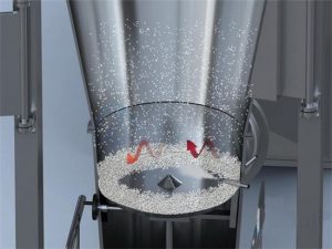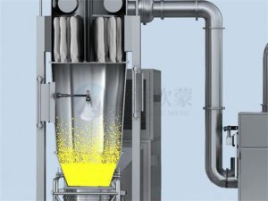 空氣經(jīng)加熱凈化后,由引風(fēng)機從下部導(dǎo)入,穿過料斗的孔網(wǎng)板。在工作室內(nèi),經(jīng)攪拌和負(fù)壓作用形成流態(tài)化,水份快速蒸發(fā)后隨著排氣帶走,物料快速干燥。